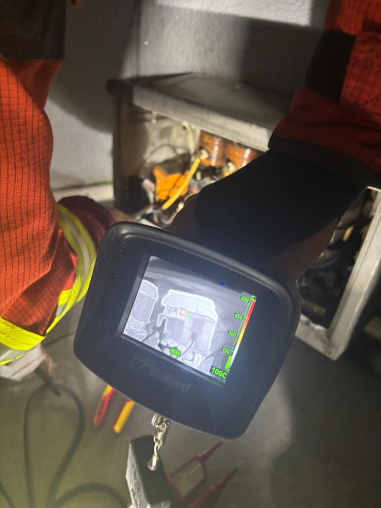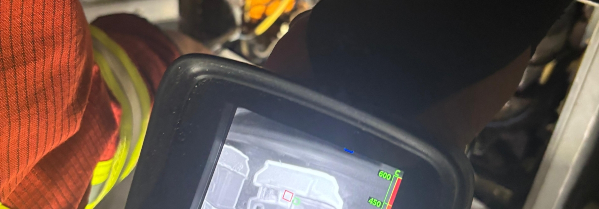 Vor Ort stellte sich heraus, dass in einem Metallkasten das Vorschaltgerät für Teile einer Leuchtreklame am schmoren war. Umgehend haben wir eine Sicherung im Keller ausgeschaltet und unter Wahrung von Sicherheitsmaßnahmen den Kasten geöffnet. Mittels der Wärmebildkamera konnten wir dann die Ursache finden.