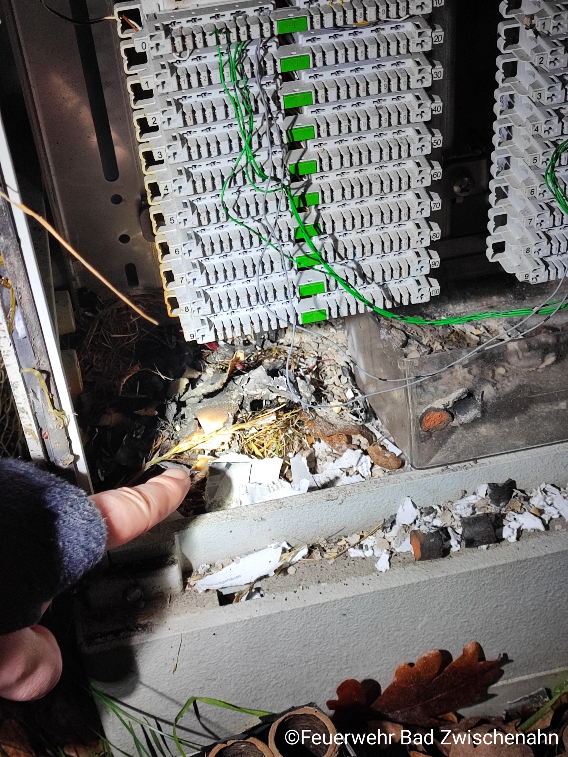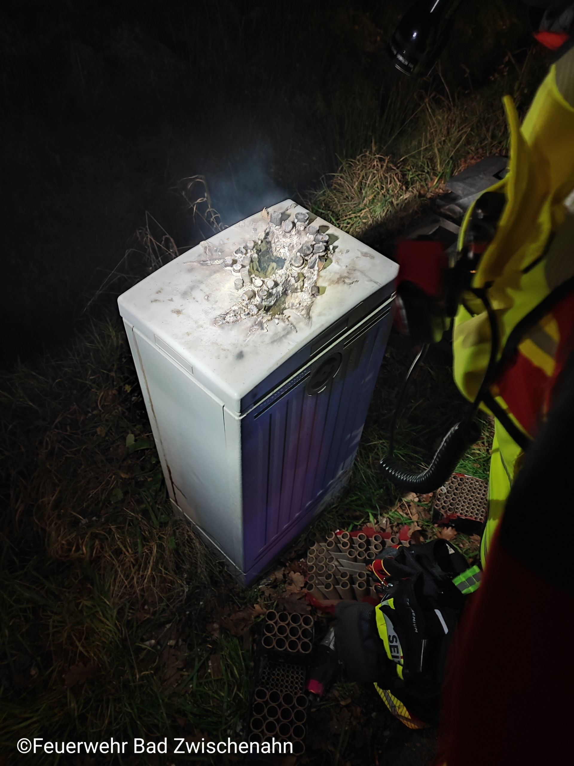Gerade wieder eingerückt und umgezogen, erreichte unsere Silvesterbereitschaft im Feuerwehrhaus über Funk der nächste Einsatz. Diesmal ging es in den eigenen Ortsteil zu einem gemeldeten Stromkastenbrand. Vor Ort angekommen bestätigte sich die Lage insoweit, dass Rauch aus dem Kasten aufstieg, es sich aber entgegen der ersten Meldung nicht um einen Stromkasten, sondern um einen Telefon-Verteilerkasten handelte. Vermutlich aufgrund einer Feuerwerksbatterie geriet dieser in Brand.