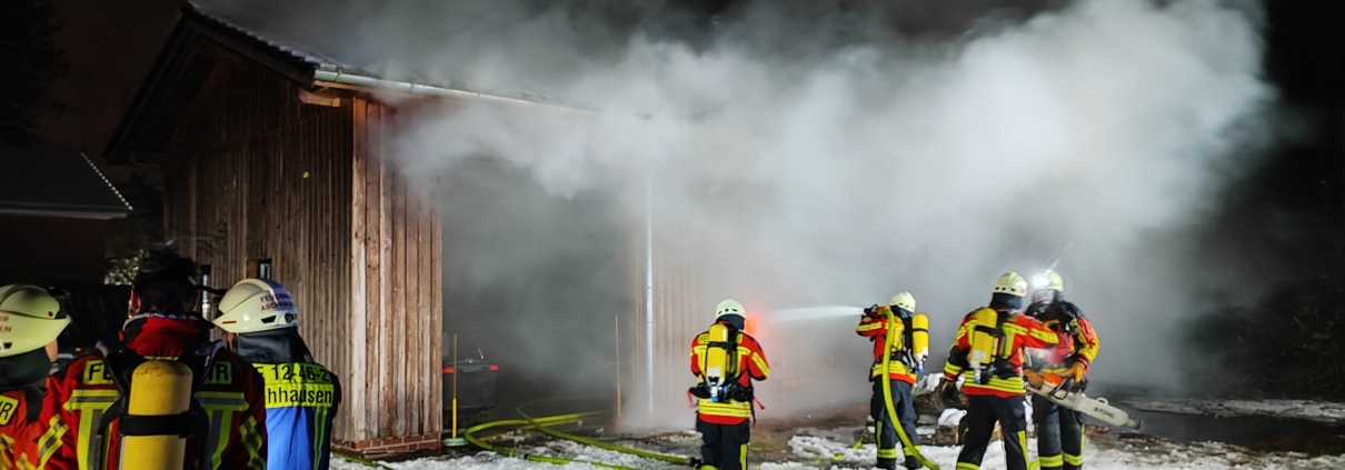 Als die ersten Einheiten an der Einsatzstelle eintrafen, stand der Unterstand der Garage bereits in Vollbrand. Auch der Dachstuhl und weitere Teile der Garage waren bereits vom Feuer betroffen. Bei dem Objekt handelte es sich um einen großen Schuppen, in dem auch eine Garage untergebracht war.