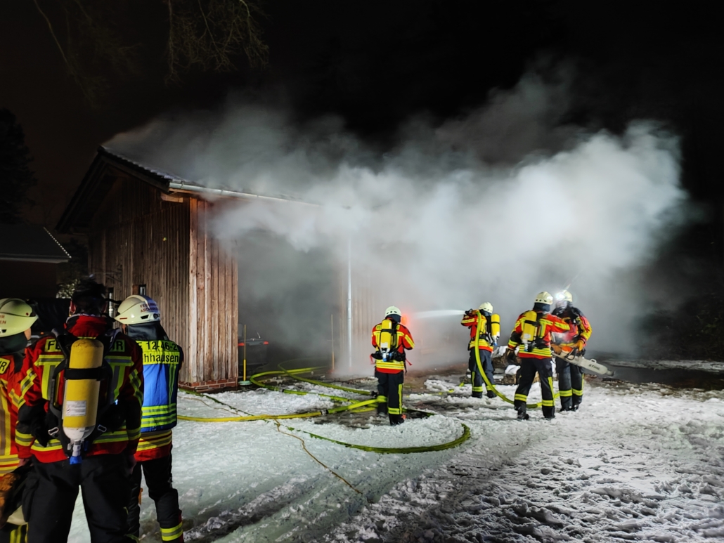 Als die ersten Einheiten an der Einsatzstelle eintrafen, stand der Unterstand der Garage bereits in Vollbrand. Auch der Dachstuhl und weitere Teile der Garage waren bereits vom Feuer betroffen. Bei dem Objekt handelte es sich um einen großen Schuppen, in dem auch eine Garage untergebracht war.