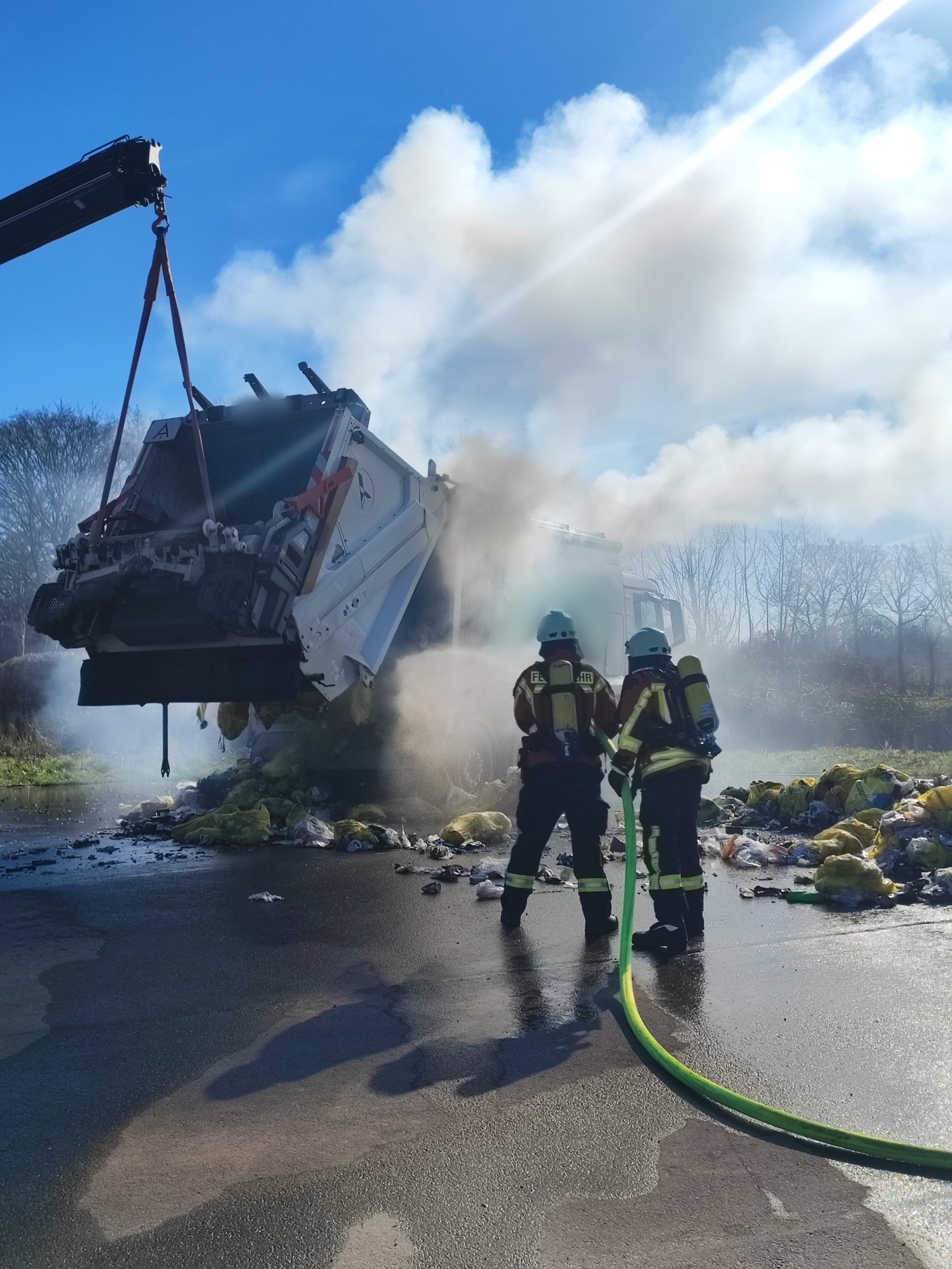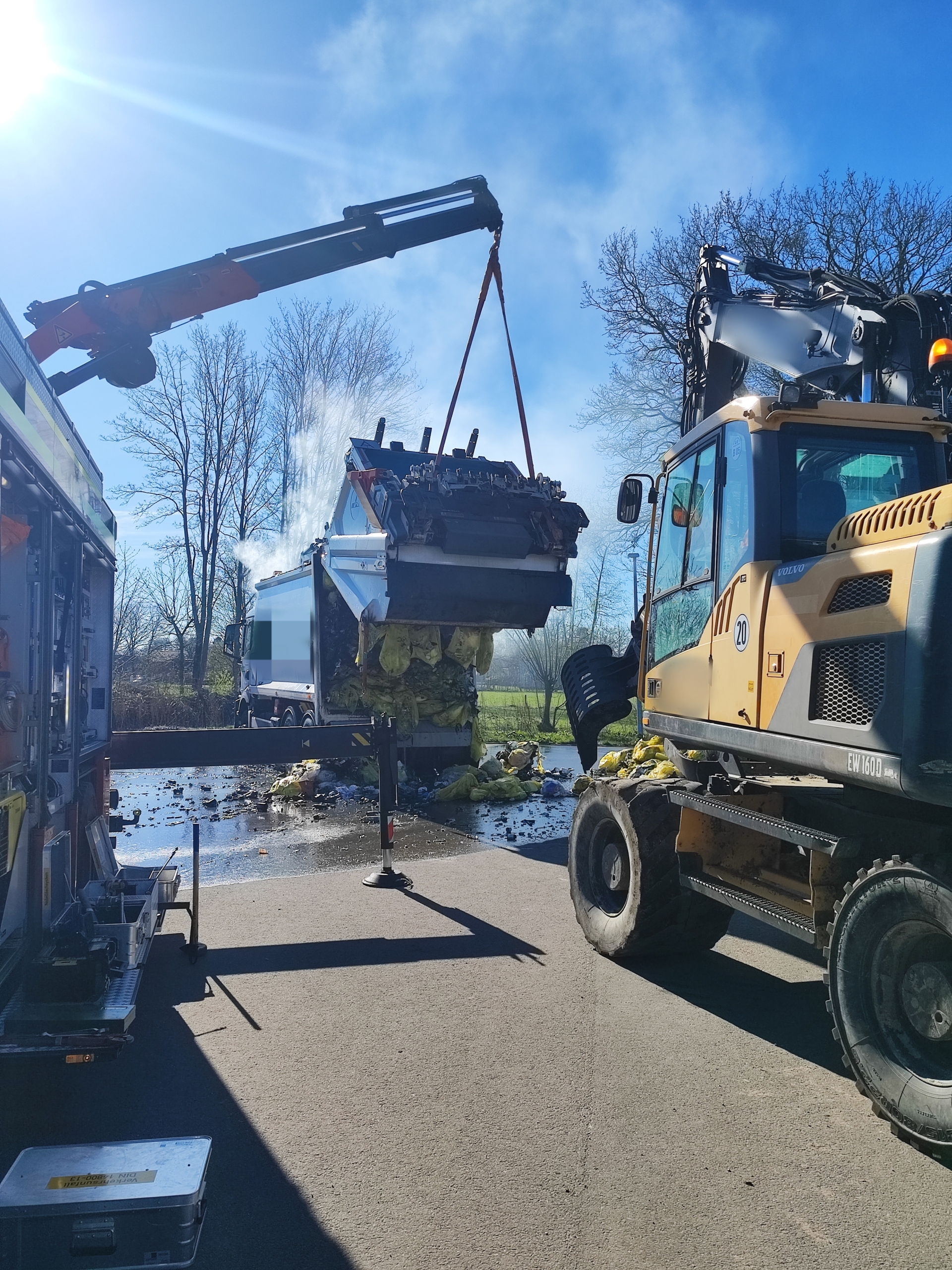Mit Hilfe eines Baggers und eines entsprechenden Aufsatzes, sowie dem Rüstwagen Kran der TZ Ammerland, wurde die Hinterklappe des Müllwagens geöffnet und das brennende Gut nach und nach aus dem Fahrzeug geholt und anschließend von bereitstehenden Trupps unter Atemschutz abgelöscht.