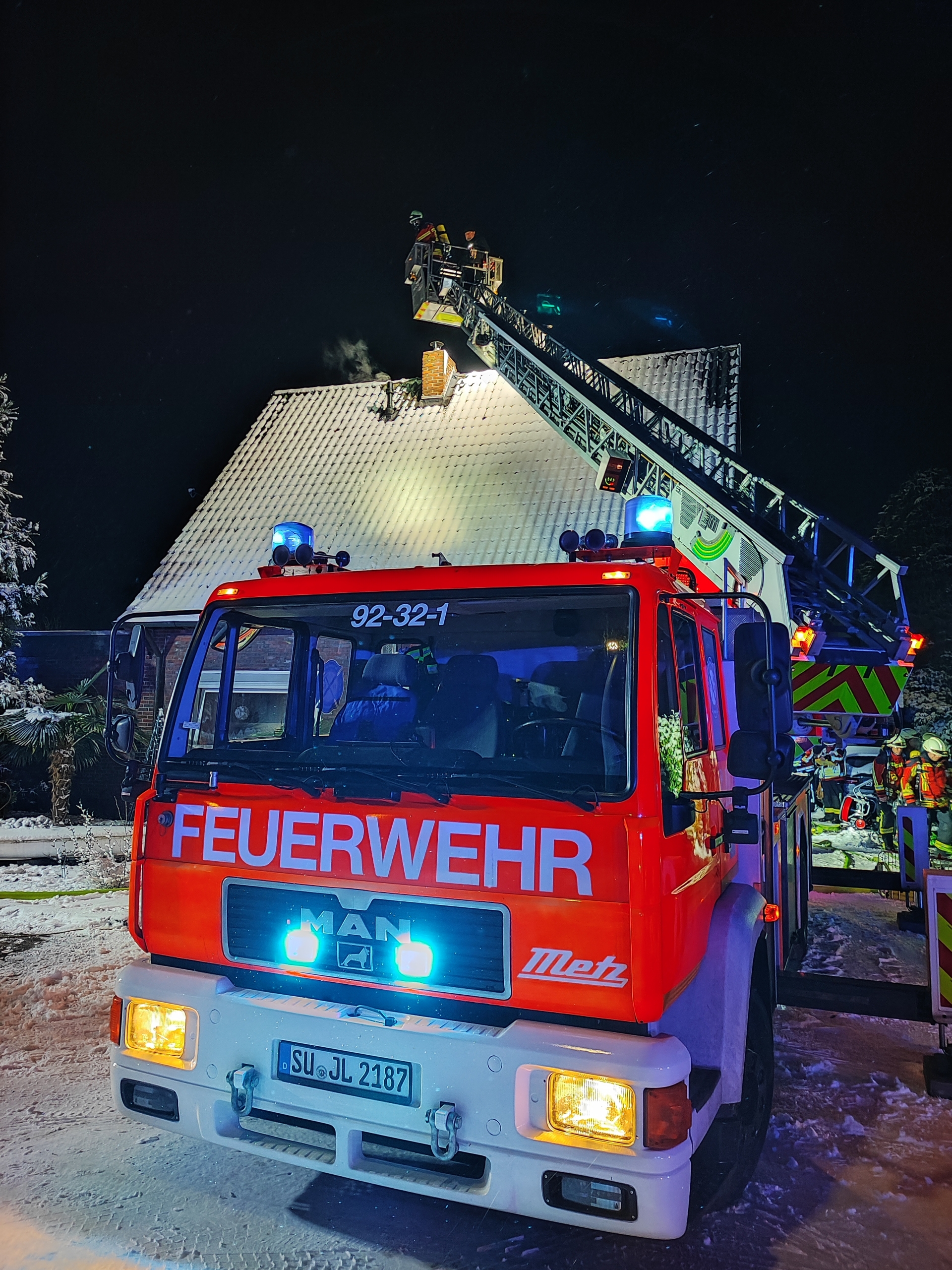 Zusammen mit den Kameraden aus Elmendorf und der Drehleiter, sowie dem zuständigen Bezirksschornsteinfegemeister wurde die Erkundung vom Dach aus vorgenommen. Anschließend wurde der Schornstein gekehrt und das Brandgut nach und nach abgetragen.