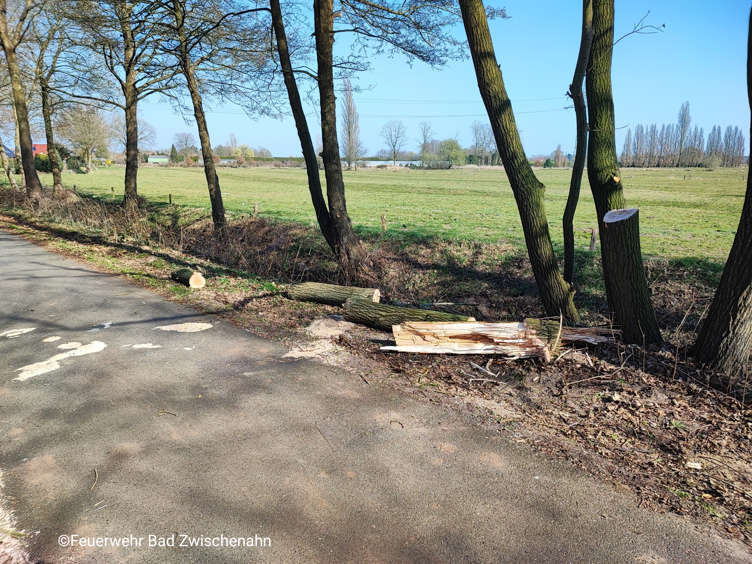Vor Ort angekommen, versperrte ein größerer abgebrochener Ast einen Radweg, den wir mittels Motorsäge beseitigt haben.