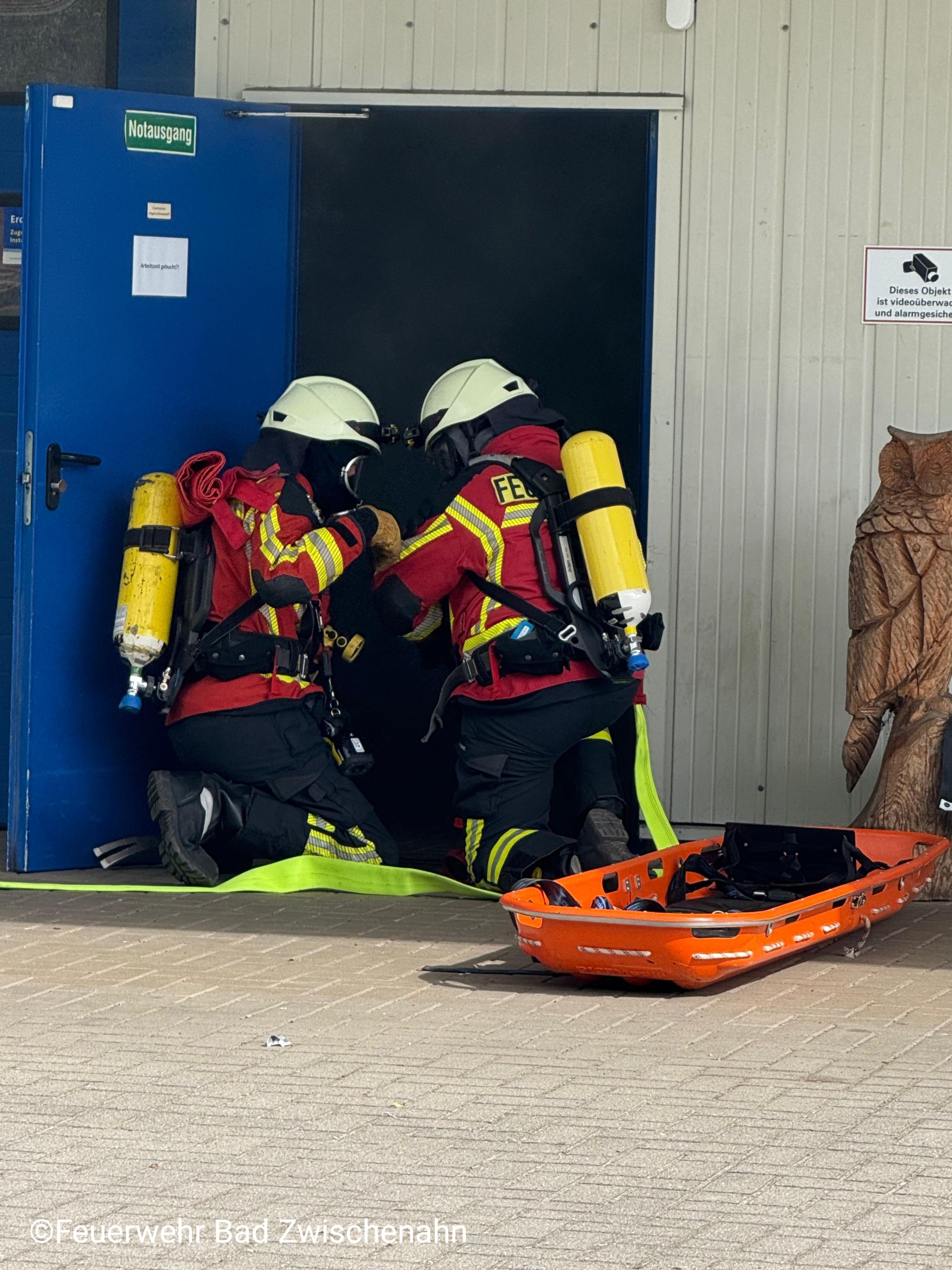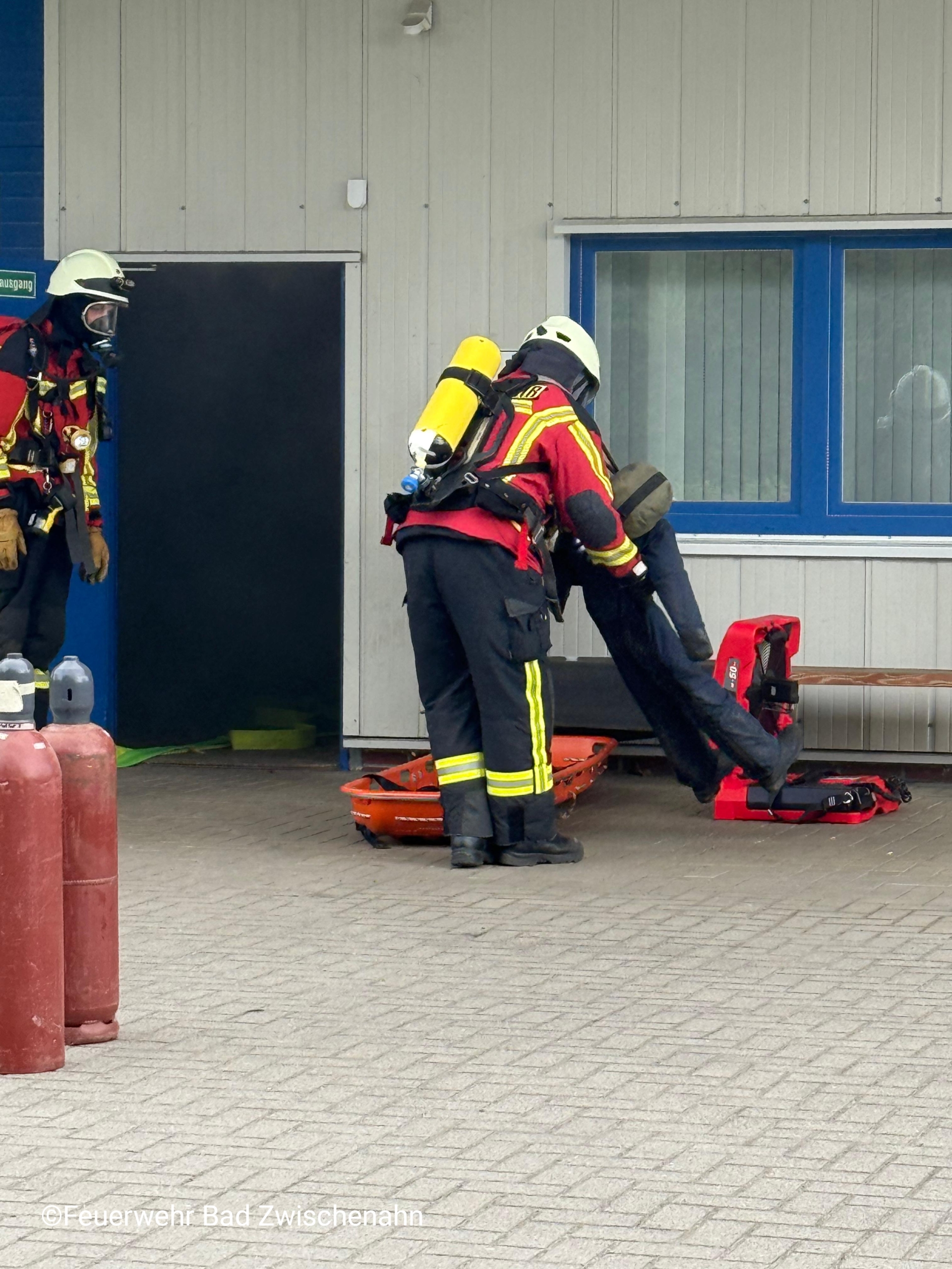 Der Einsatzleitwagen der Feuerwehr Bad Zwischenahn fuhr zuerst die Einsatzstelle an und ging umgehend zur Erkundung vor. Wenig später trafen dann auch die weiteren Fahrzeuge aus Bad Zwischenahn und Edewecht ein. Sofort wurden Maßnahmen zur Menschenrettung getroffen und die Wasserversorgung sichergestellt. Mehrere Trupps unter schwerem Atemschutz gingen anschließend in die stark verrauchte Halle (mittels Nebelmaschinen dargestellt) vor, um die vermissten Personen zu lokalisieren und zu retten. Dabei wurden auch 2 Gasflaschen ins Freie gebracht. Im Außenangriff wurde durch einen Trupp der simulierte Carportbrand bekämpft.